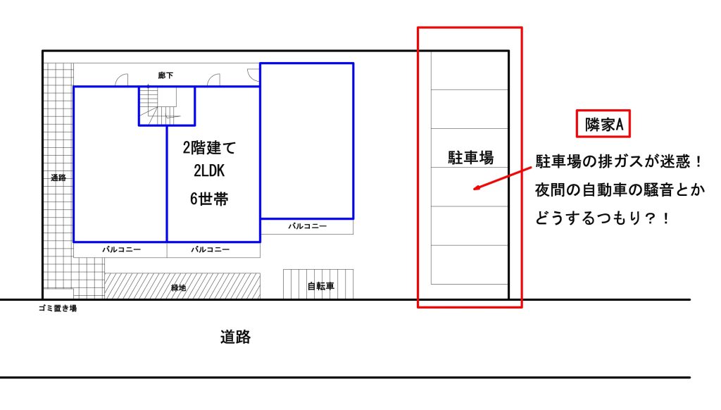 駐車場に面したお隣からは、車の騒音と排気ガスを言われることが多いです。