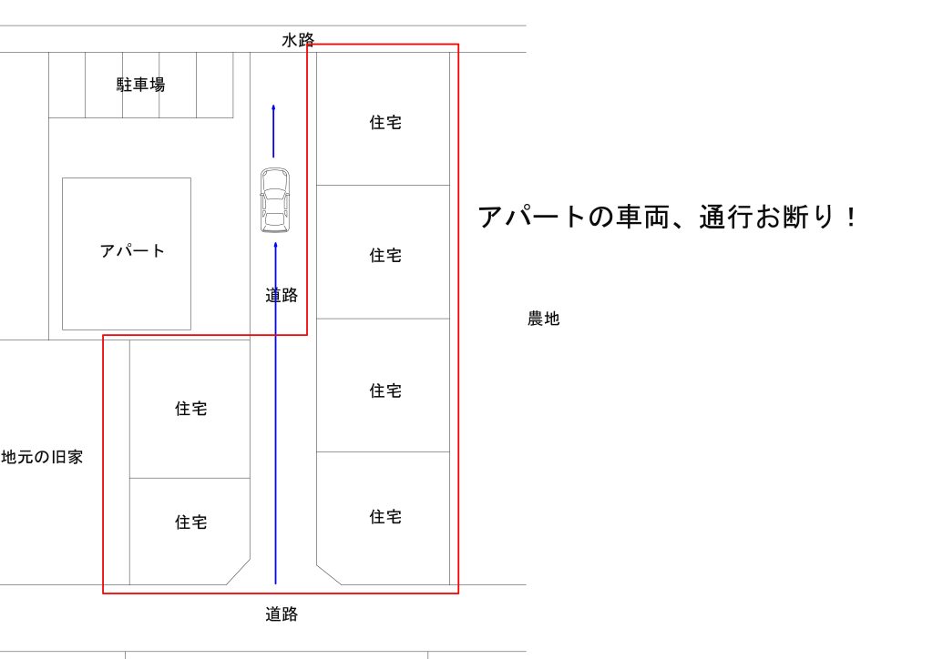 (この道路は公道で市町村の持ち物なので、本来は誰でも通ることができます)