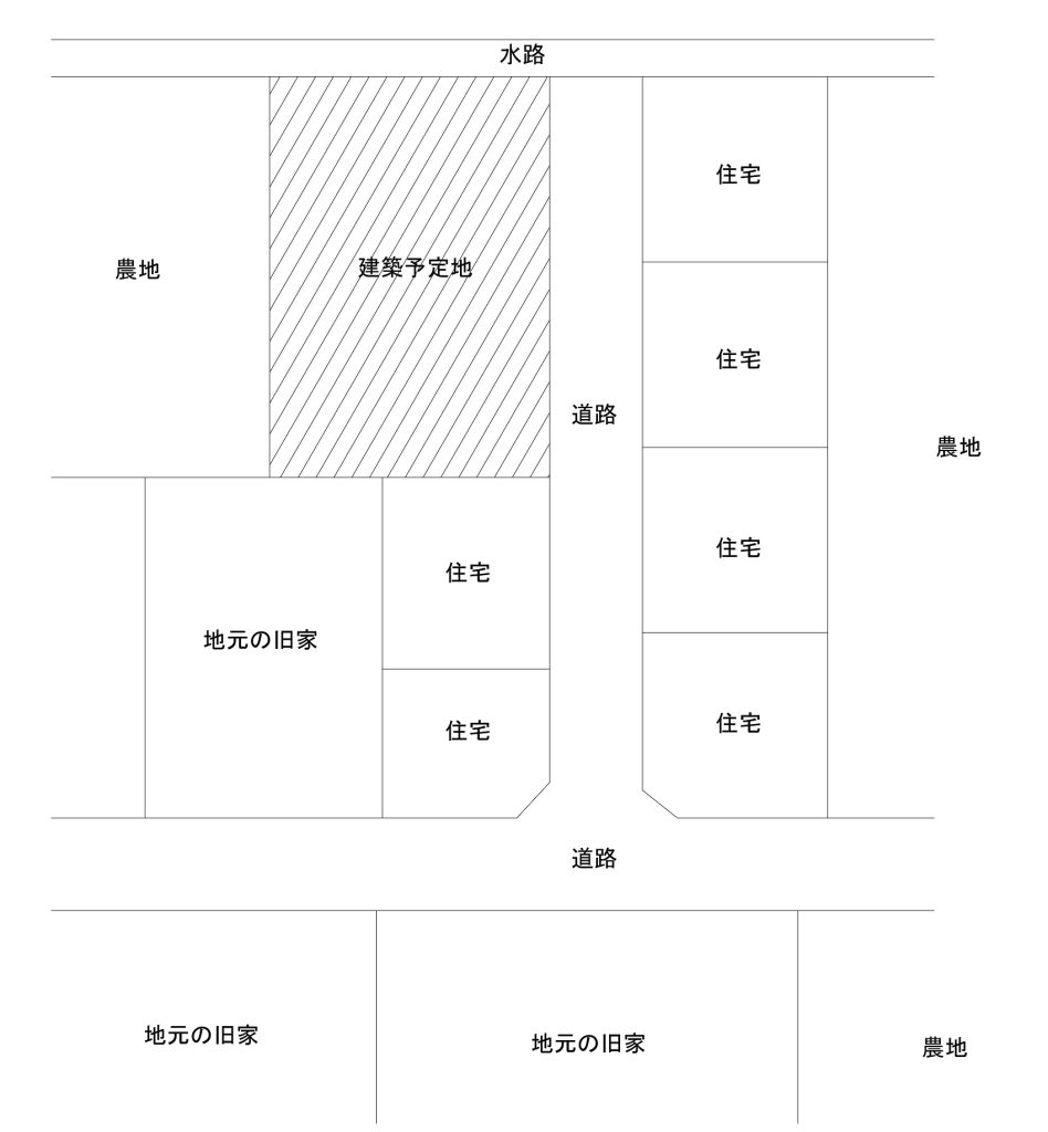 以前に私が担当させていただいたお客様の建築予定地が、ミニ開発の住宅6軒の奥にあって