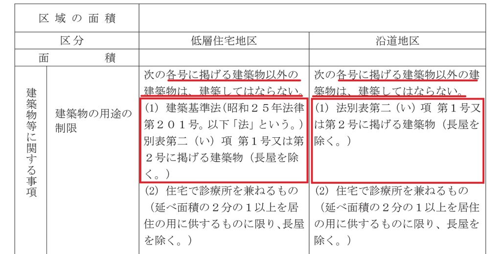 上の表の赤枠で囲んだ部分の「建築基準法 別表第二 (い)項 第1号または第2号」には