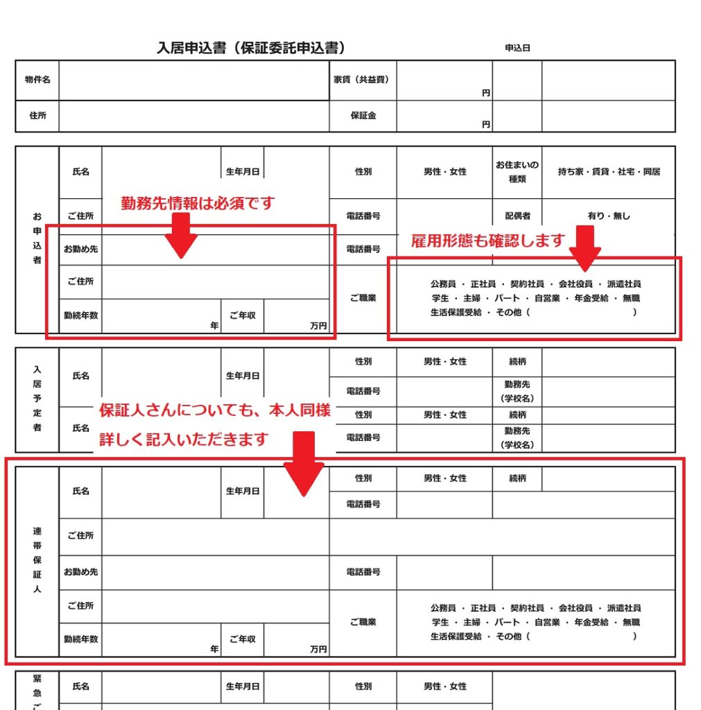 また、お勤め先やご年収、保証人さんのお名前や連絡先を記入する欄もあります。