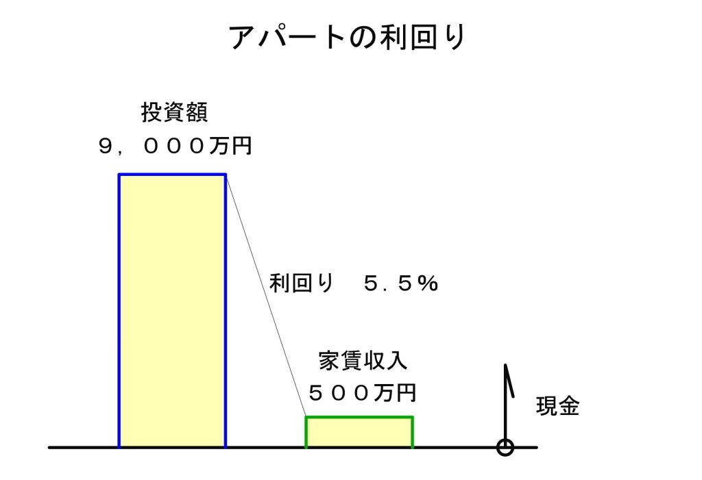 そうすると、もし現金で建てたとしたらアパートの利回りは、500万円÷9,000万円=約5.5%ということになります。