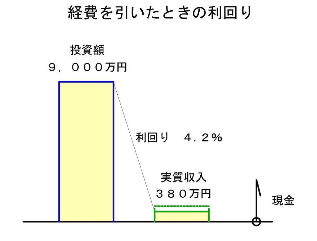 この手取り380万円を建築費で割り算すると、380万円÷9,000万円=4.2%という利回りになる計算です。