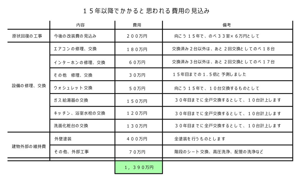 これからの15年(15年目から30年目まで)に、どのくらいの費用がかかってくるでしょうか?という問いに対して、管理会社さんと相談して予想をしてみました。