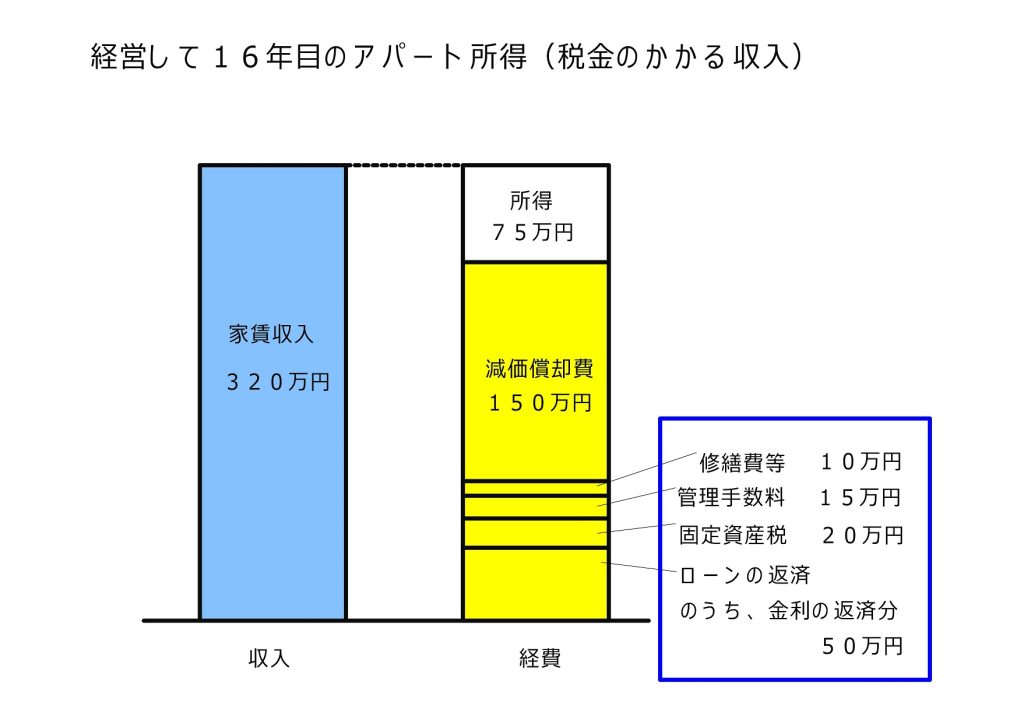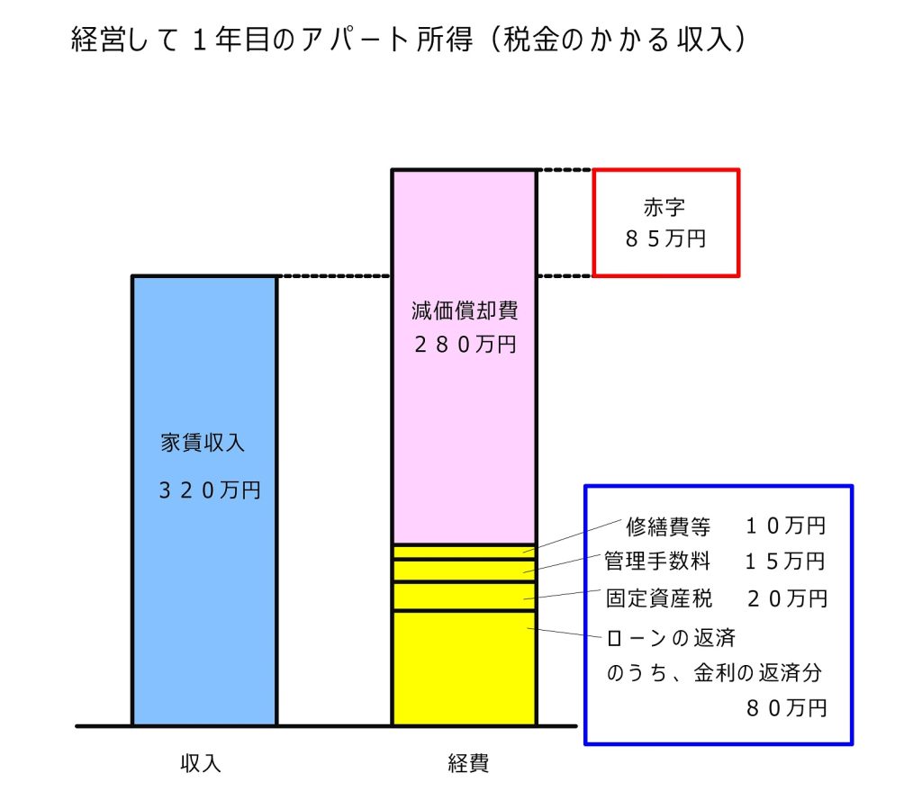 まず知って頂きたいことは、アパート経営で実際に手もとに入ってくる年間の収入と、所得税がかかってくる所得とは金額が違う、という点です。