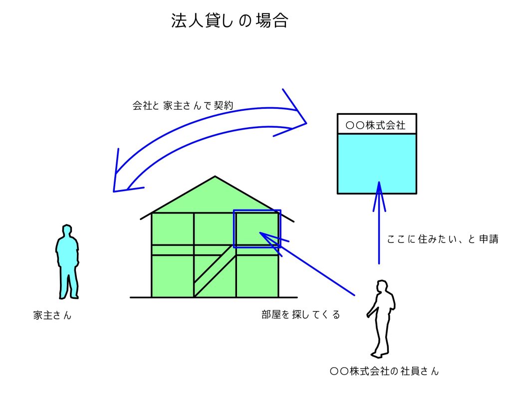 • 社宅貸しは長期の会社契約のことで、法人貸しは普通の短期の賃貸契約とほぼ同じ