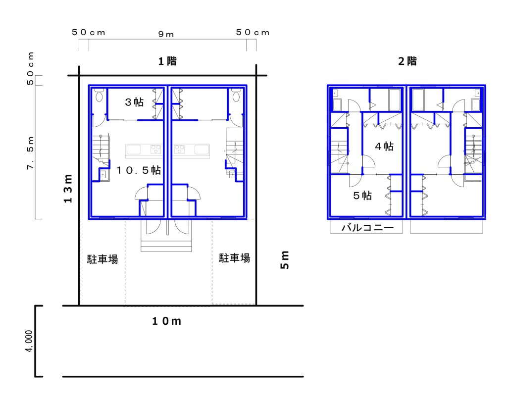 - 長屋建て(テラスハウス)2戸の案でファミリー向けでもいいかも