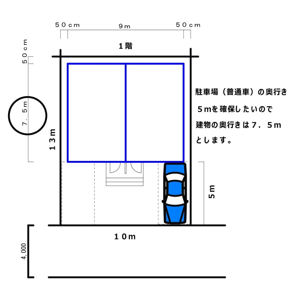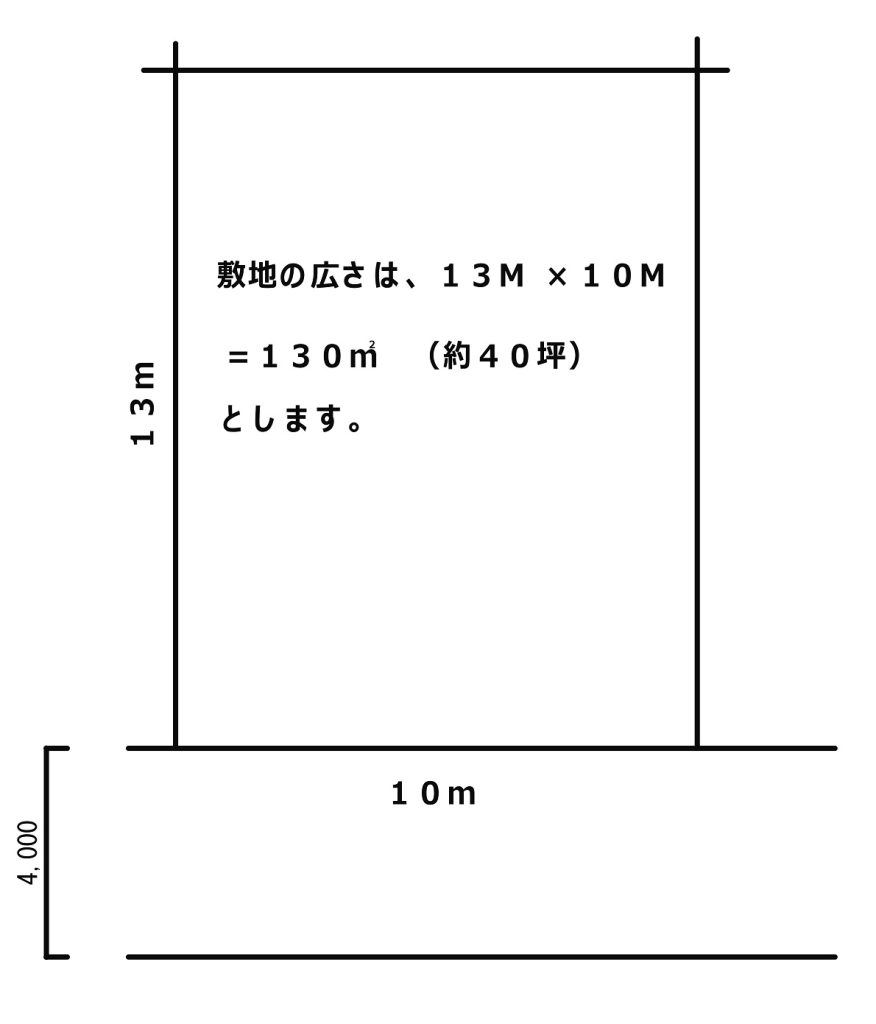 仮で、間口(横幅)が10M 奥行き(縦幅)が13Mだとすると、こんな形になります。