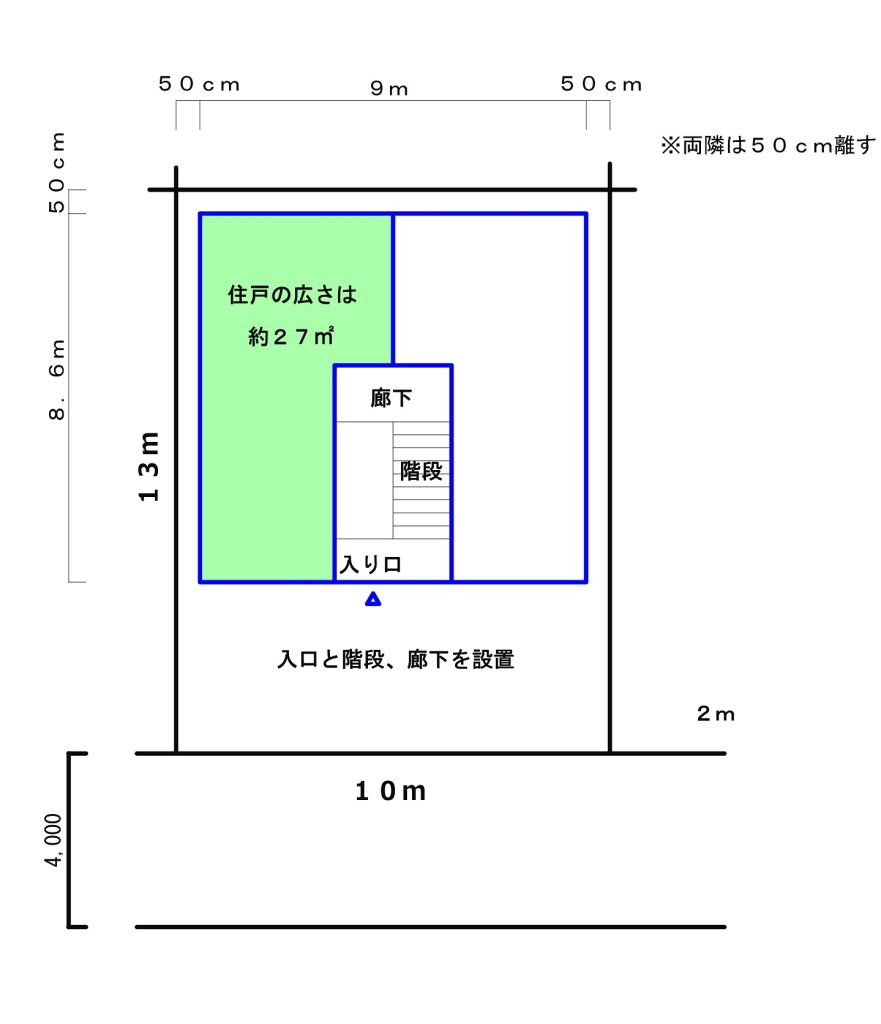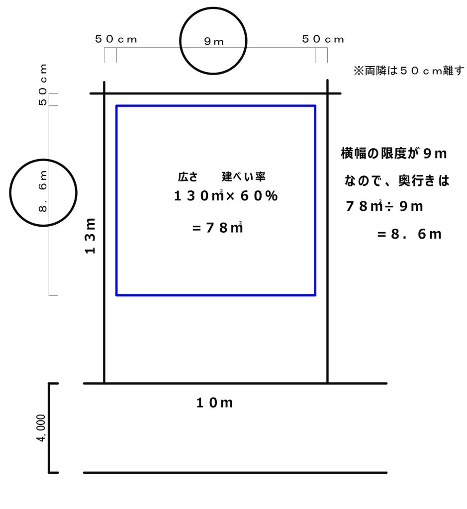 78㎡の建物の間口(横幅)の大きさは、お隣との距離を50cmづつ離すとしたら9Mなので