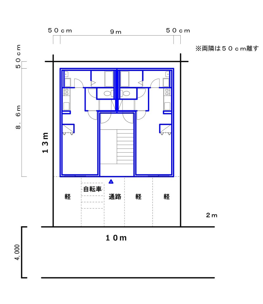 左右それぞれが、1階と2階を一戸建て住宅のように使えるプランニングで、各お部屋に1台づつ駐車場を設置しています。