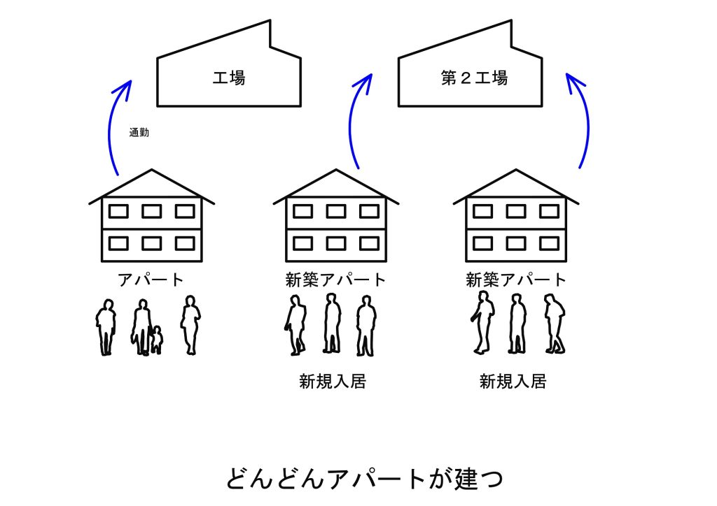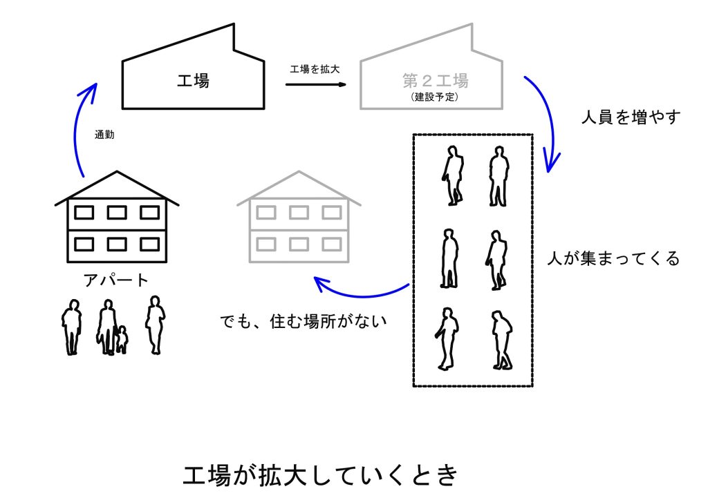 工場の近くに派遣社員の方が住むためのアパートがたくさん建てられました。